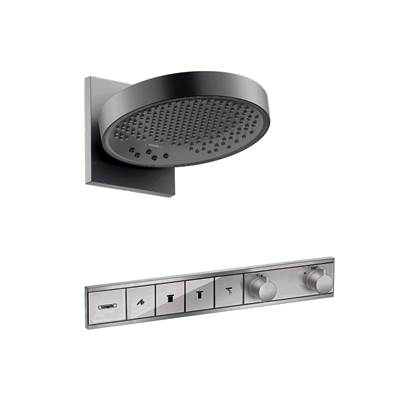 The RainSelect concealed thermostatic mixer with 4 functions provides a user-friendly shower system. Large soft-click buttons with wear-resistant symbols divert the water between a handshower (sold separately) and the included showerhead. The easy to use knobs allow you to easily adjust your water volume and temperature. The high-quality finish is long-lasting and easy to clean. The shut-off function helps to stop water flow when pressure is placed on the Select buttons, adding an extra layer of security. The hansgrohe shower thermostat allows you to set your desired water temperature, protecting you from excessively hot or cold water. An extra safety lock only releases hot water once a button is pressed (SafetyStop). The elegant, concealed installation of the hansgrohe RainSelect shower thermostat creates space for care-free, unobstructed showering. This shower set requires the Rainfinity Rough set (Part No. 04865180) for installation.