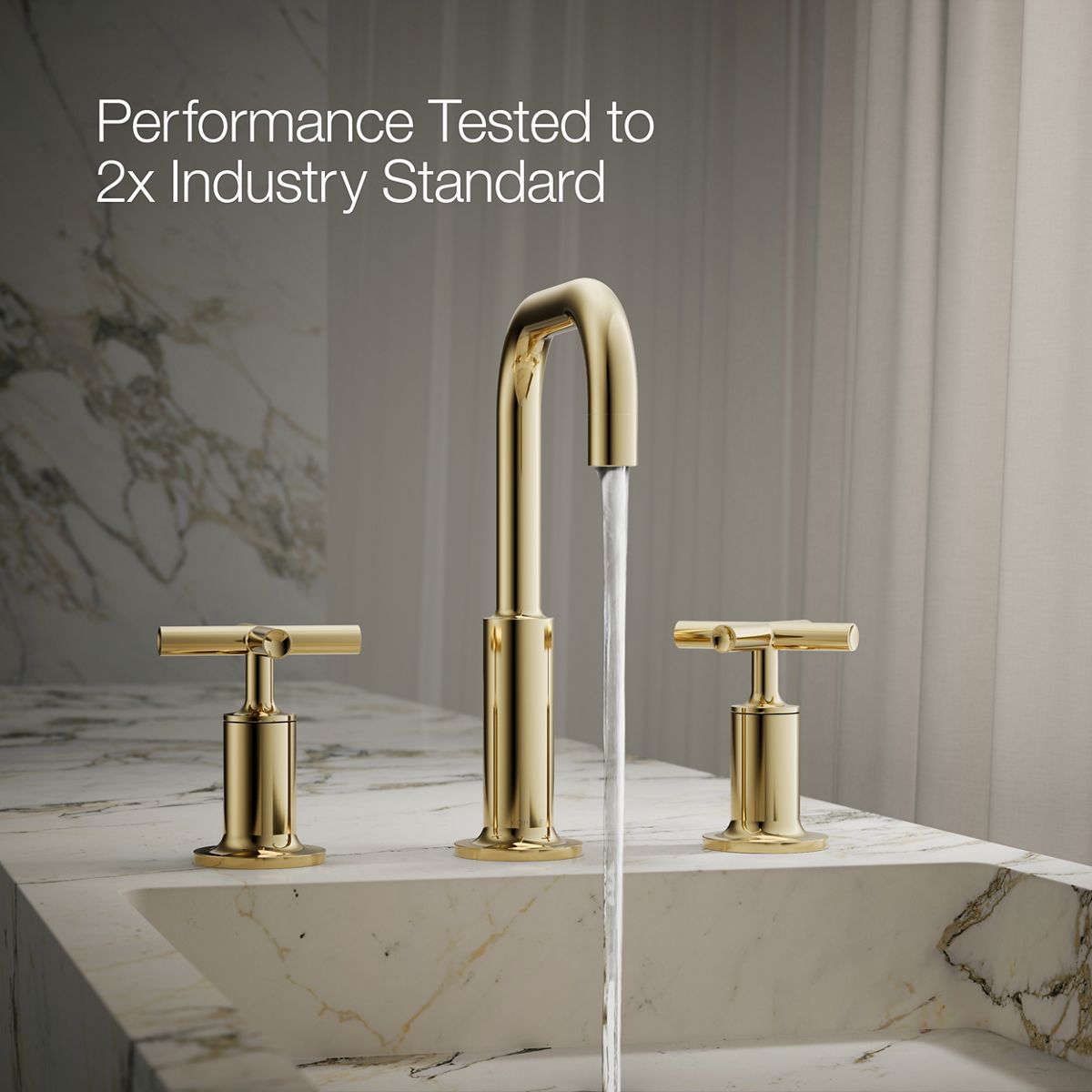 Combining architectural forms with sensual design lines, KOHLER® Purist faucets and accessories bring a touch of modern elegance to your bathroom. This widespread bathroom sink faucet exemplifies the Purist collection's understated style, with its low gooseneck spout and cross handles. Easy-to-install and leak-free UltraGlide® valves provide reliable performance and durability. The spout features laminar flow, which helps conserve water while preventing splashing.
