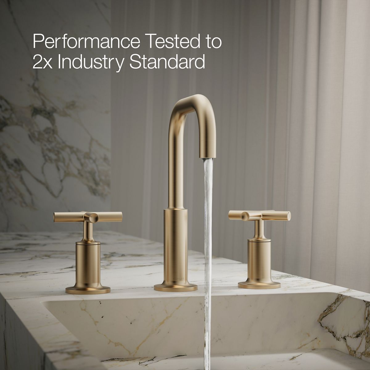 Combining architectural forms with sensual design lines, KOHLER® Purist faucets and accessories bring a touch of modern elegance to your bathroom. This widespread bathroom sink faucet exemplifies the Purist collection's understated style, with its low gooseneck spout and cross handles. Easy-to-install and leak-free UltraGlide® valves provide reliable performance and durability. The spout features laminar flow, which helps conserve water while preventing splashing.
