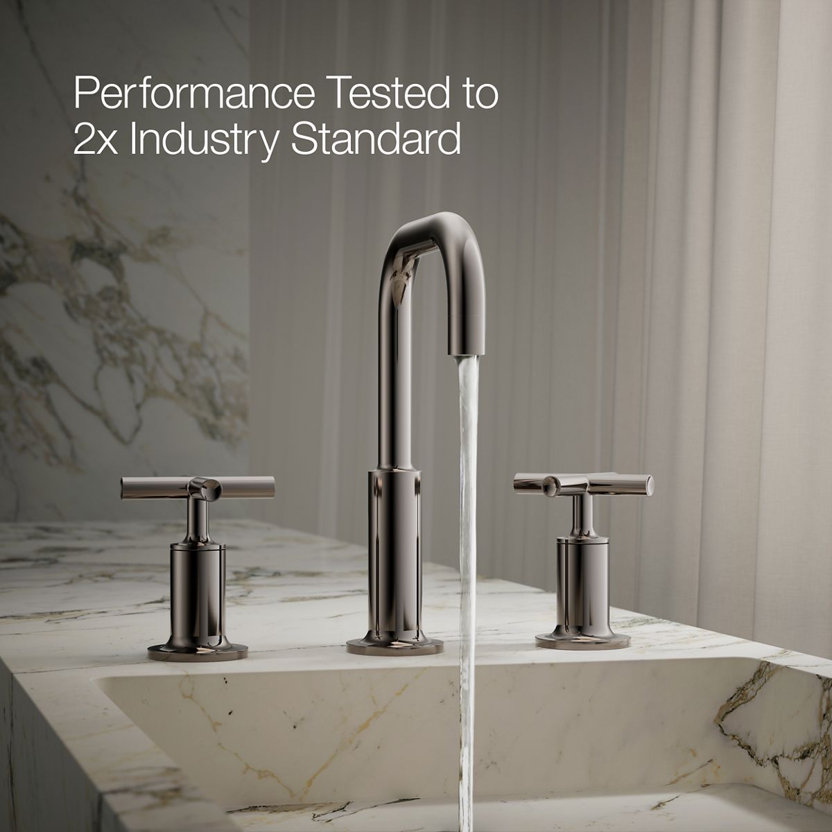 Combining architectural forms with sensual design lines, KOHLER® Purist faucets and accessories bring a touch of modern elegance to your bathroom. This widespread bathroom sink faucet exemplifies the Purist collection's understated style, with its low gooseneck spout and cross handles. Easy-to-install and leak-free UltraGlide® valves provide reliable performance and durability. The spout features laminar flow, which helps conserve water while preventing splashing.