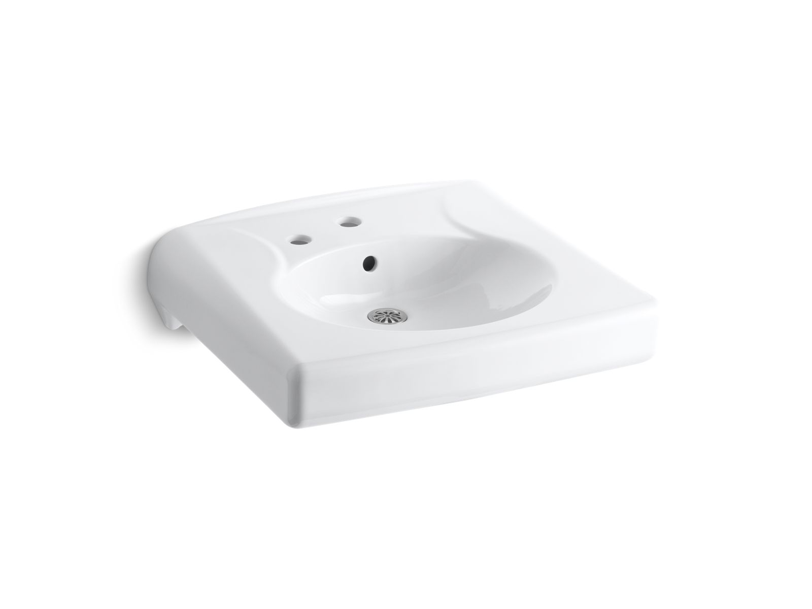 BrenhamE Wall-mount or concealed carrier arm mount commercial bathroom sink with 4'' centerset faucet holes and shroud, antimicrobial finish - White