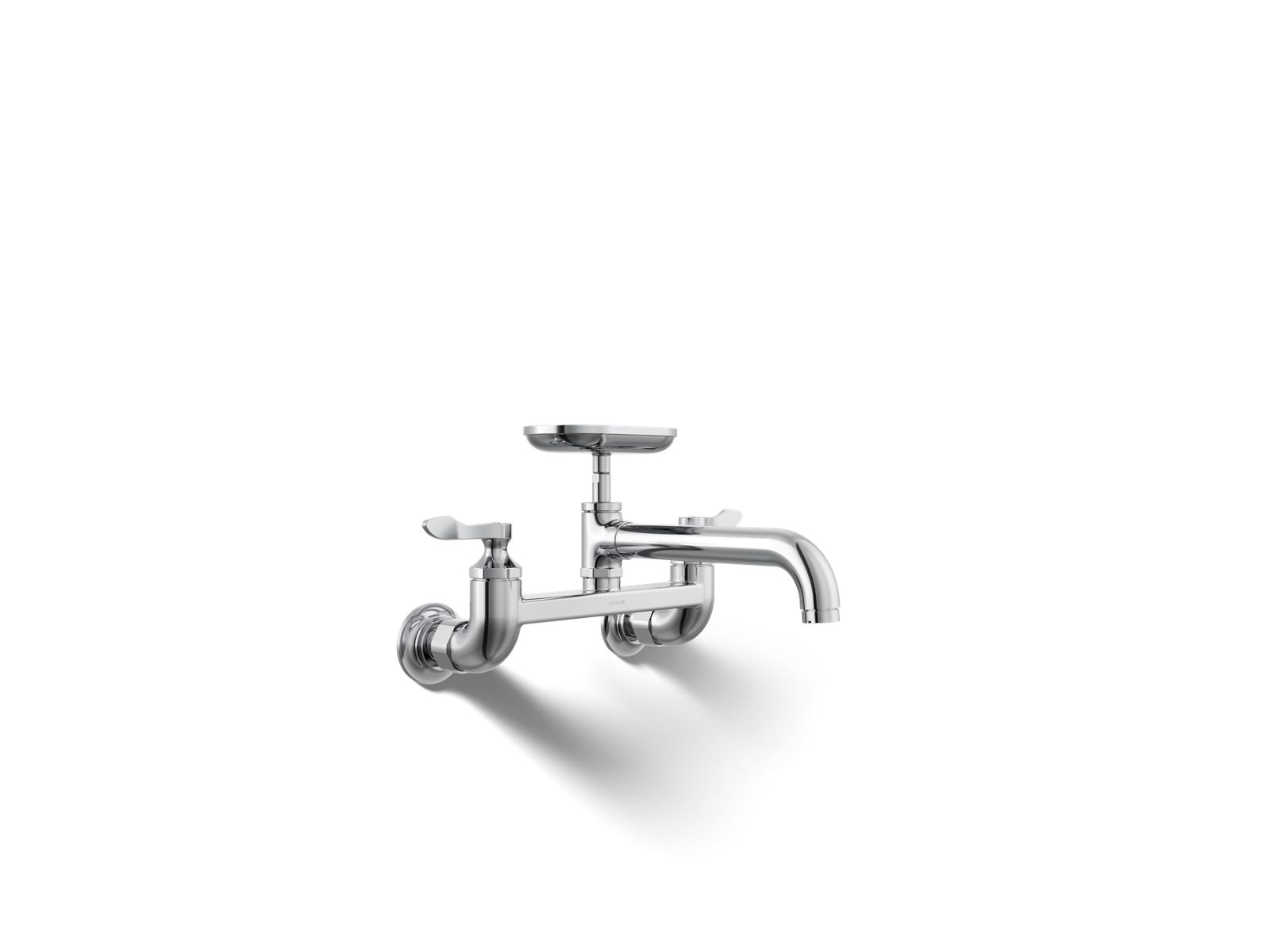 This KOHLER® Clearwater two-hole wall-mount bridge kitchen sink faucet offers a swing spout for easy clearance, two handles for positive control of hot and cold water, and a conveniently attached soap dish.