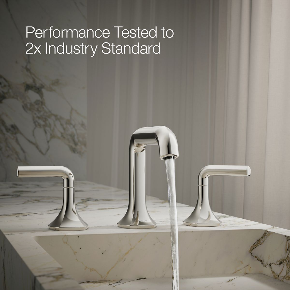 Unapologetically luxurious and truly unforgettable, KOHLER® Occasion bathroom sink faucets and accessories draw inspiration from 1960s Hollywood glamour and extravagance. Fashioned after the era’s sleek dress lines and bold car designs, the Occasion collection reflects graceful elegance, blending classic midcentury and modern design. Customize your bath with the collection’s distinctive pentagonal accents, faceted bases, flowing lines, and delicate edges. Choose a spout, handles, and finish to build your own signature design. Minimalist with soft square angles, the Occasion widespread bathroom sink faucet spout with Straight design pairs with your choice of Occasion sink faucet handles for a look as fashionable as it is functional.