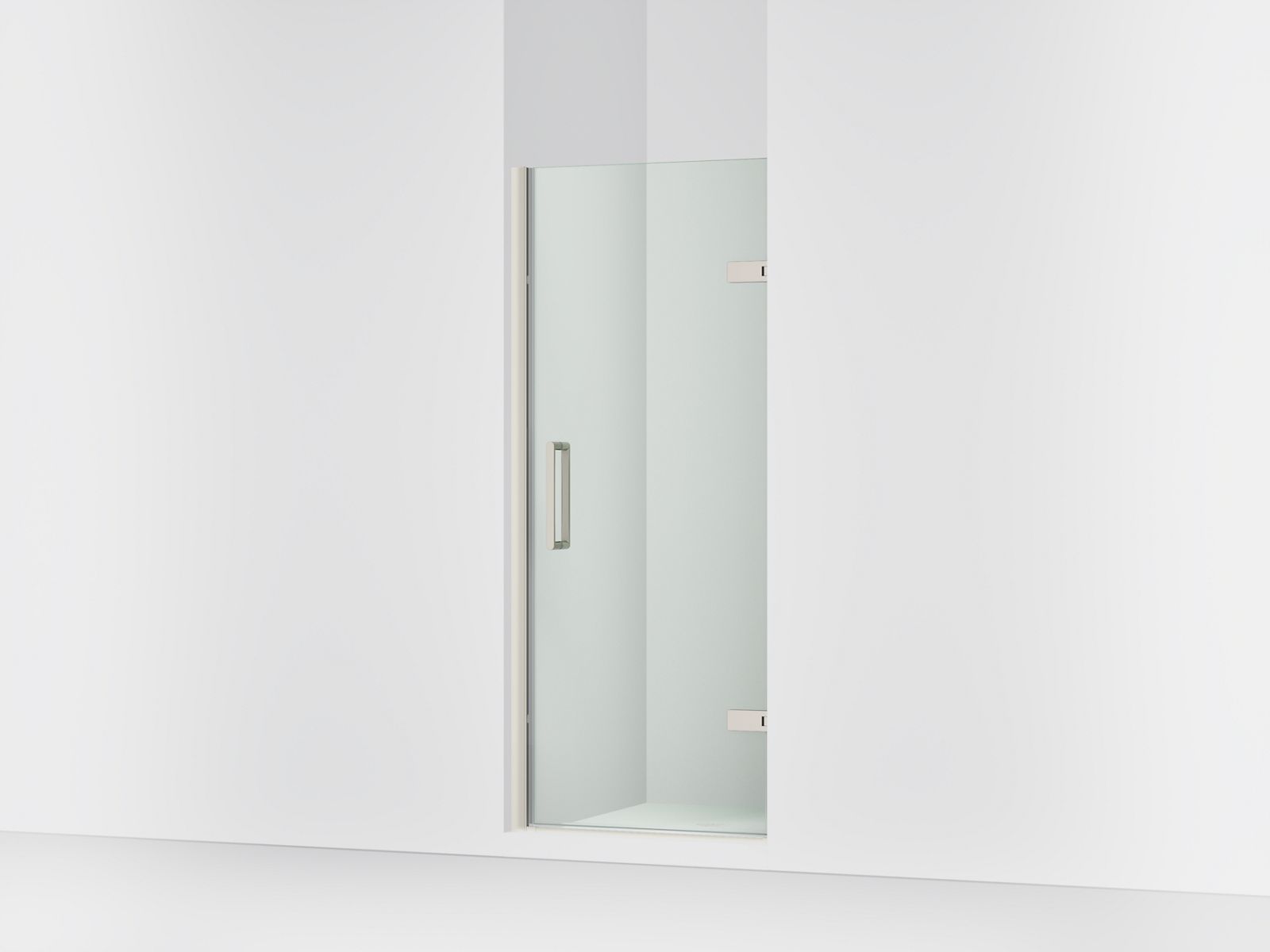 Kohler ComposedE Frameless pivot shower door, 71-5/8″ H x 29-5/8 - 30-3/8″ W, with 3/8″ thick Crystal Clear glass - Anodized Brushed Nickel