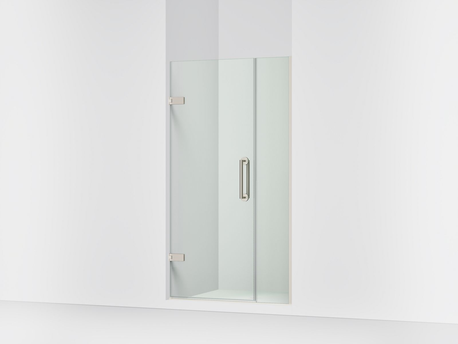 Kohler ComponentsE Frameless pivot shower door, 71-9/16″ H x 33-5/8 - 34-3/8″ W, with 3/8″ thick Crystal Clear glass - Anodized Brushed Nickel