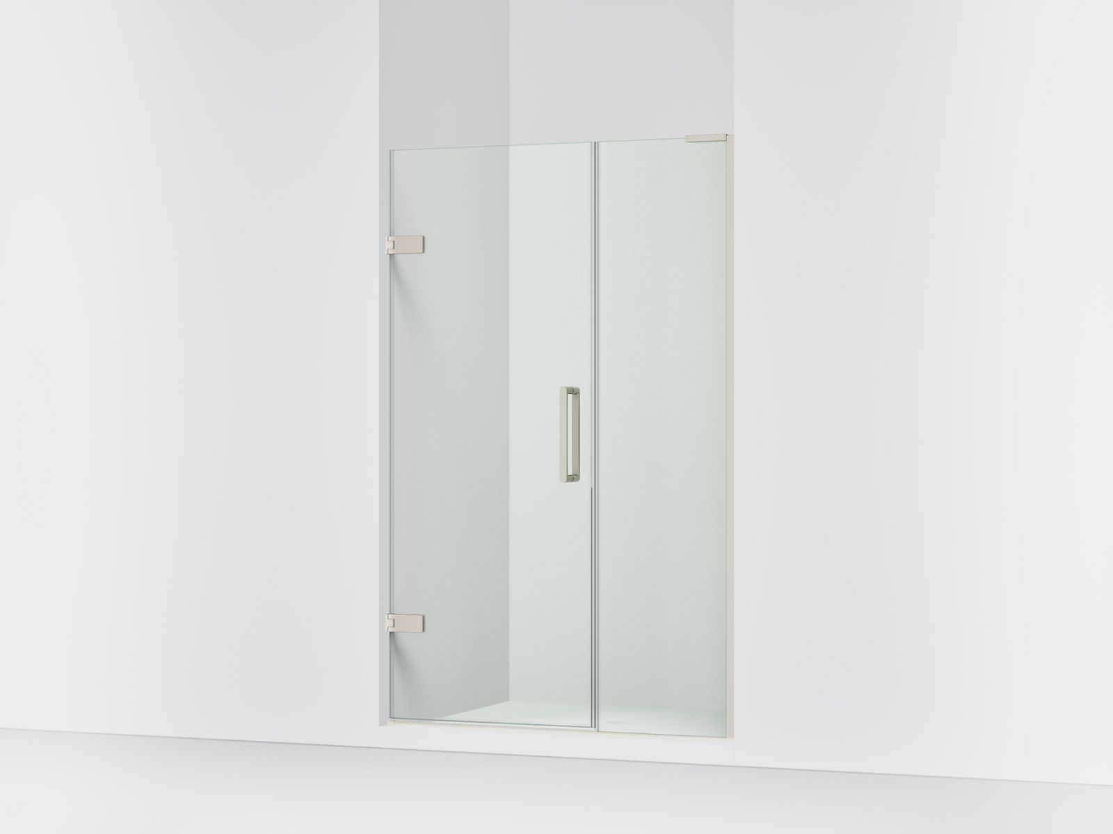 Kohler ComposedE Frameless pivot shower door, 71-3/4″ H x 45-1/4 - 46″ W, with 3/8″ thick Crystal Clear glass - Anodized Brushed Nickel