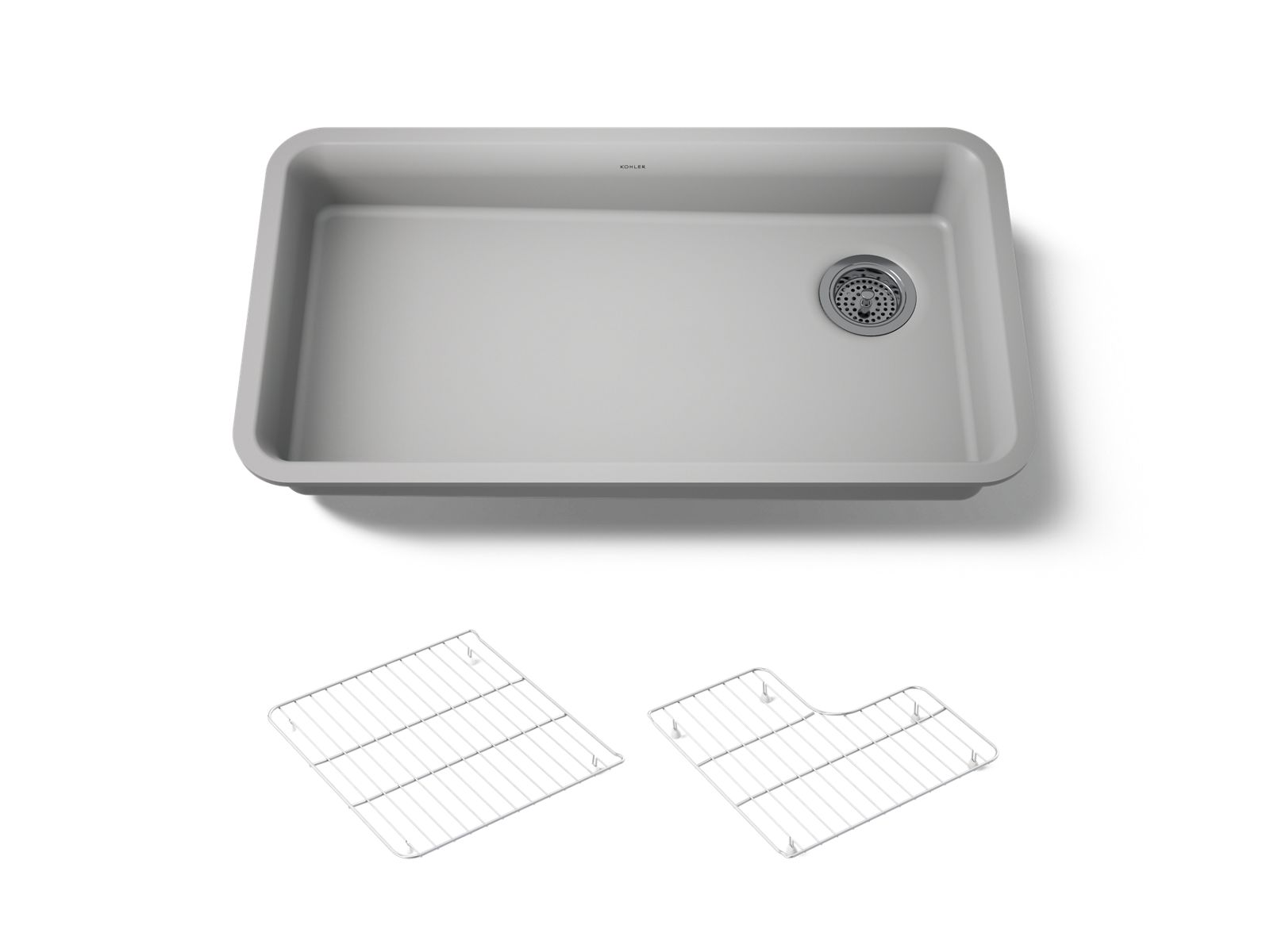 With soft French curves, the KOHLER® Cairn single-bowl kitchen sink offers transitional style to suit contemporary and traditional kitchens alike. The Cairn undermount kitchen sink is made of KOHLER® Neoroc®, a matte-finish composite material designed for extreme durability and unmatched beauty. Richly colored to complement any countertop, Neoroc resists scratches, stains, and fading and is highly heat- and impact-resistant. The Cairn ADA-compliant sink offers thoughtful accessibility with a shallow 5" bowl depth and a rear-offset drain location that increases workspace in the sink and space underneath for wheelchair accessibility.