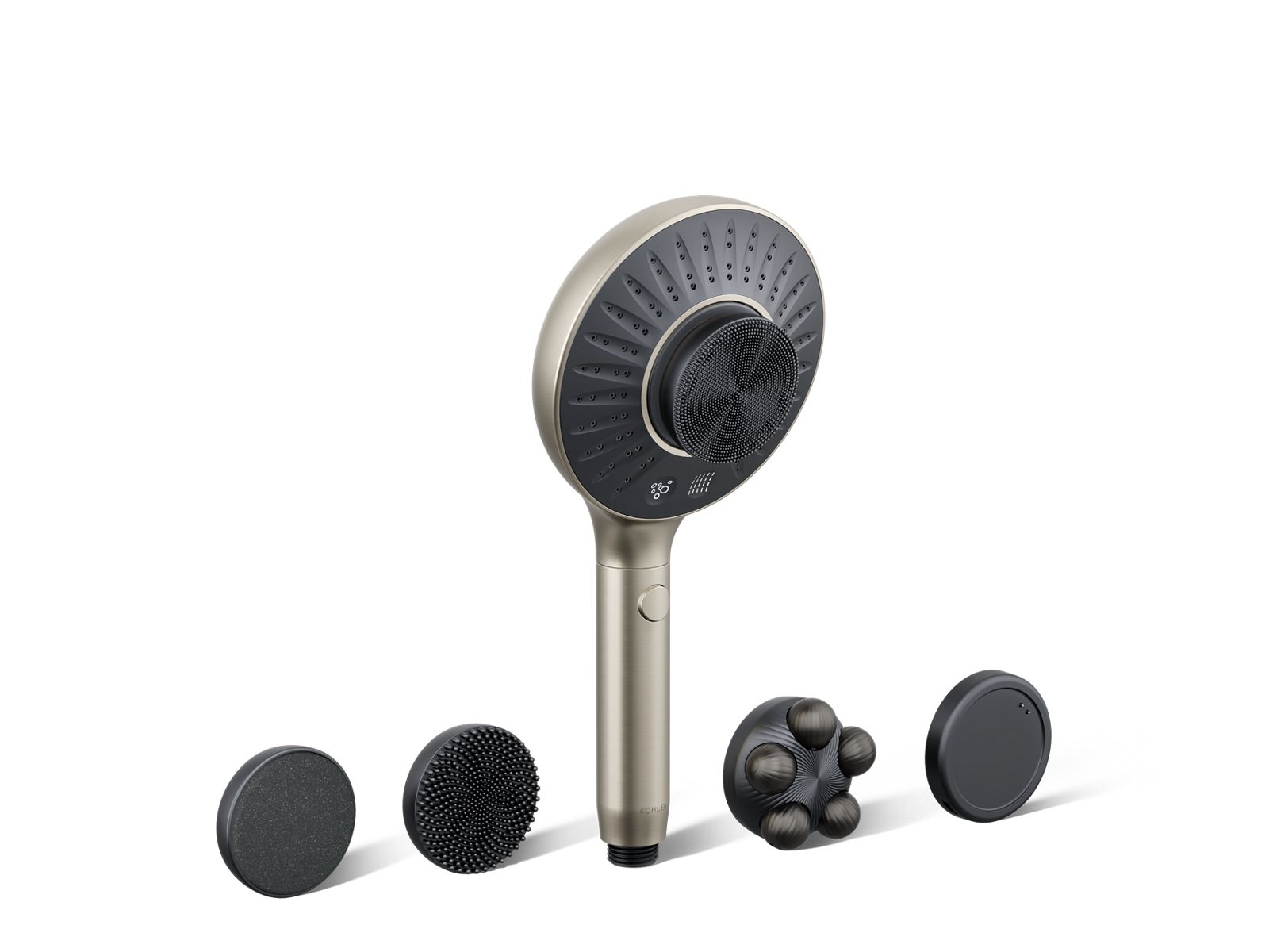 The KOHLER® SpaViva handshower and all-in-one cleansing device is the ideal power pair to revolutionize your in-shower self-care routine. The round wall-mount handshower features the pore-penetrating power of MicroBubble spray while also offering full-coverage Katalyst® spray that retains more heat with each drop. The all-in-one cleansing device magnetically docks into the center of the handshower and features a range of versatile attachments, including a facial brush, body brush, body scrubber, and body massager. At full charge it runs for 90 minutes and rotates at a selection of three speeds. Extend the handle with the push of a button to effectively cleanse hard-to-reach areas and rejuvenate your skin from head to toe.