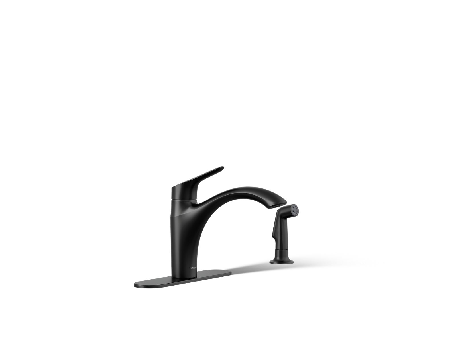 At home in classic or contemporary settings, this KOHLER® Rival kitchen sink faucet enhances any kitchen with style. The graceful arched deck-mount kitchen faucet spout is designed to reach over pots and pans, while the ergonomic lever handle and separate side sprayer make operation easy and thorough. The single lever handle offers ease of use, allowing you to turn the water on and set the temperature in one motion.