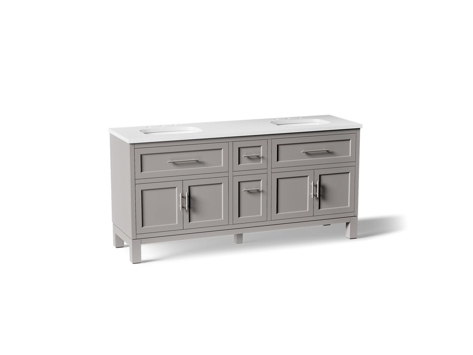 With a clean, versatile design, the KOHLER® Quo bathroom 72" freestanding single sink vanity set brings simplicity to your bathroom. This transitional design boasts generous storage space, and a coordinating quartz vanity top, two sinks, and cabinet hardware are included. Quo makes it effortless to organize your bathroom and simplify your routine.