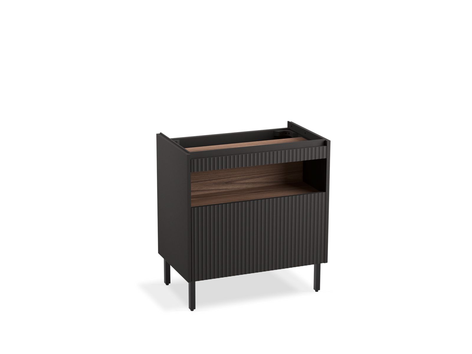 The KOHLER® Spacity 28-3/4" wall-hung bathroom vanity cabinet is designed to maximize small-space living. This 28-3/4" wall-mount single sink vanity features functional spaces with plenty of room to stow grooming accessories and other bathroom items. The contemporary cabinetry is accented with fluted paneling for a modern look. Pair this bathroom vanity cabinet with the coordinating Spacity vanity top with integrated sink for the ultimate bathroom configuration, or create your own custom look by combining it with your desired vanity top and Spacity semi-recessed vessel bathroom sink.