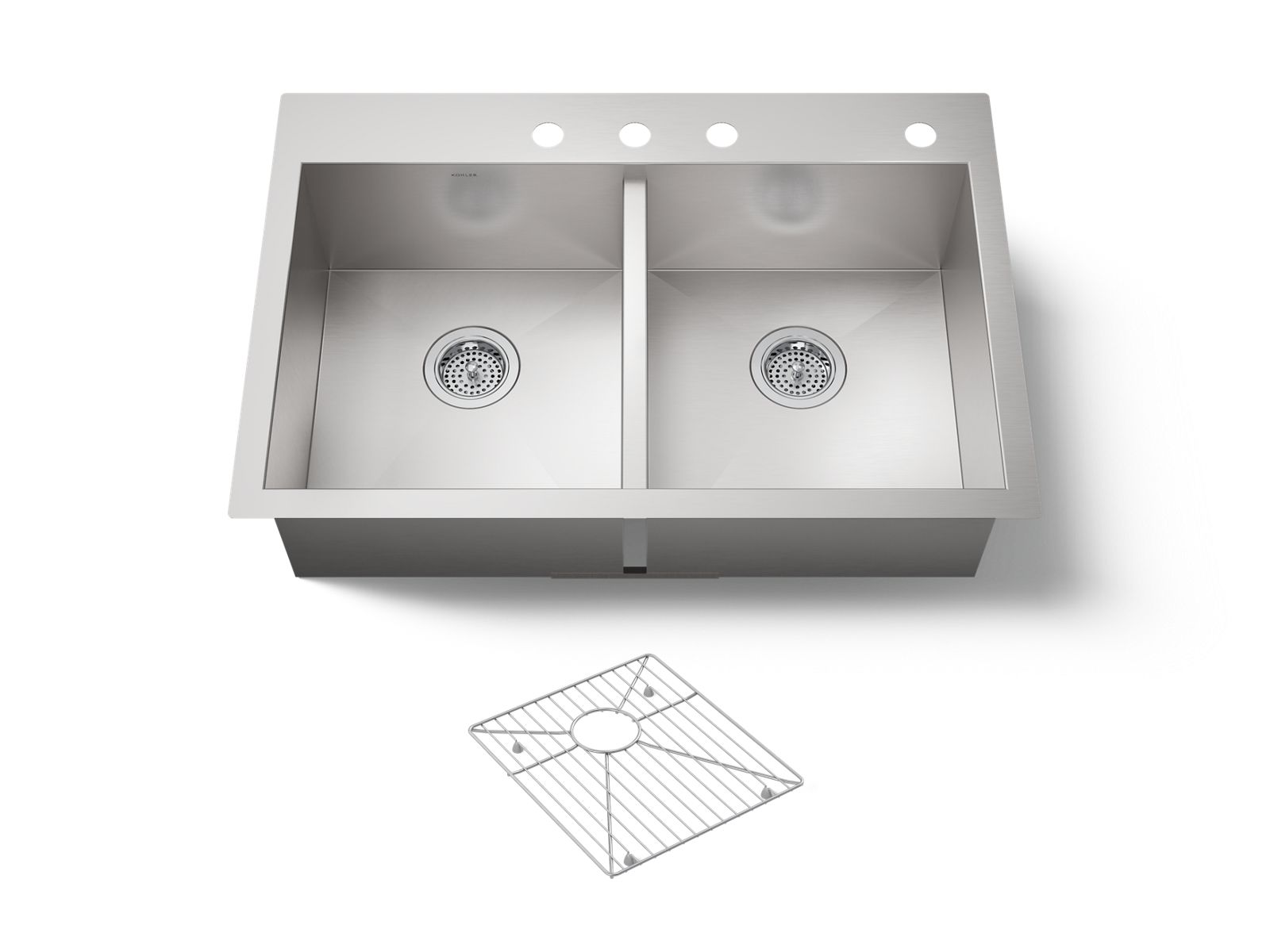 The distinctive, modern design of the KOHLER® Vault sink lends a contemporary vibe to your kitchen. Handcrafted from stainless steel, this dual-mount 33" top-/undermount double-bowl kitchen sink features a lowered divider, tightly angled corners to maximize basin space, and a sloped bottom that helps with draining and cleanup. An engineered sound-absorption system significantly reduces disposal and dishwashing noise. Vault's ultra-flat rim makes it easy to wipe from the counter directly into the sink.