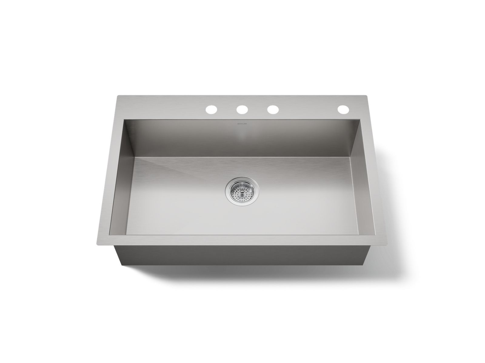 The distinctive, modern design of the KOHLER® Vault dual-mount sink lends a contemporary vibe to your kitchen. This spacious single bowl, handcrafted from durable stainless steel, is ideal for soaking and washing large pans. It features tightly angled corners to maximize basin space and a sloped bottom that helps with draining and cleanup. An engineered sound-absorption system significantly reduces disposal and dishwashing noise. Vault's ultra-flat rim makes it easy to wipe from the counter directly into the 33" top-/undermount single-bowl kitchen sink .
