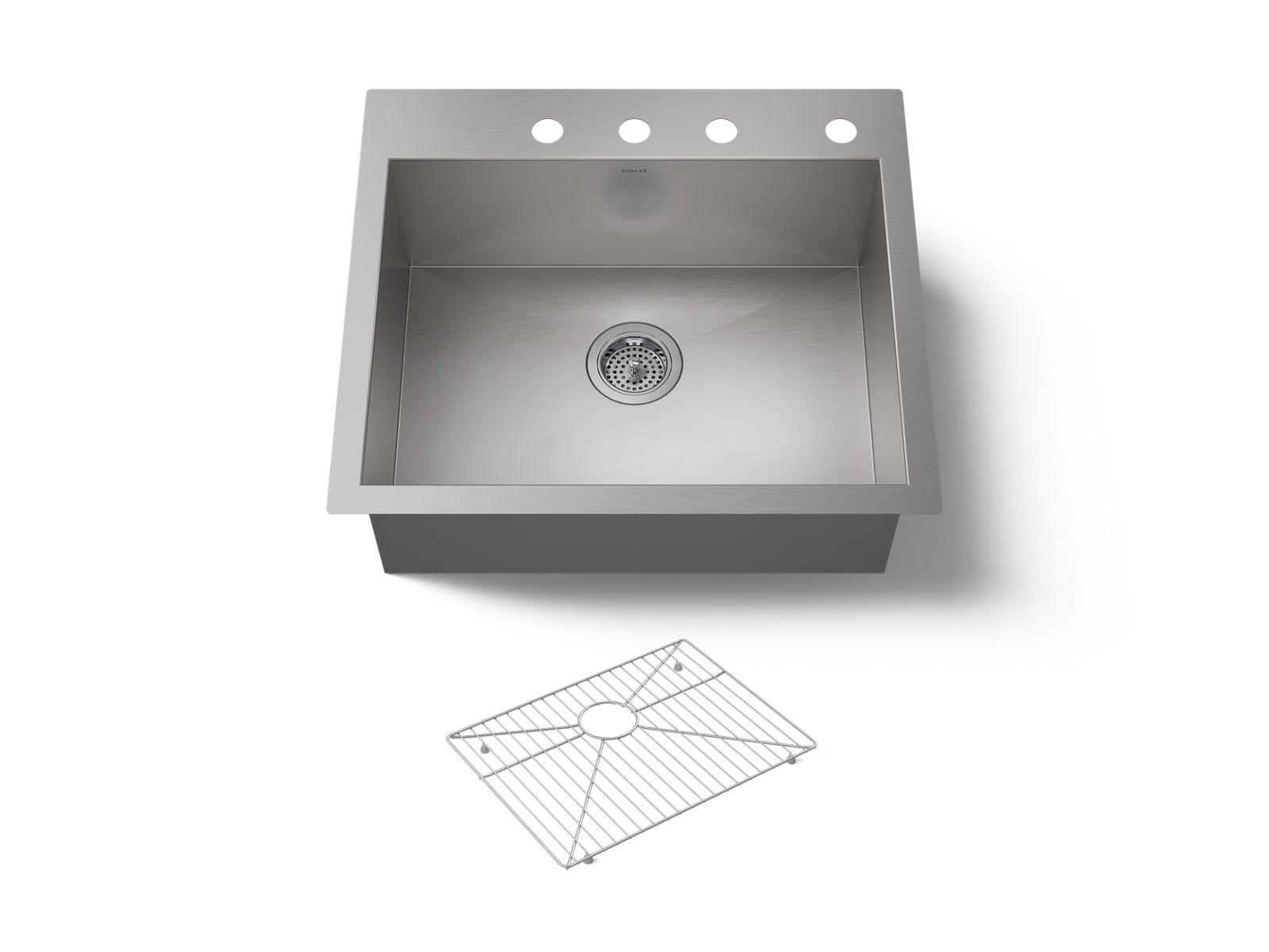 The distinctive, modern design of the KOHLER® Vault dual-mount sink lends a contemporary vibe to your kitchen. Handcrafted from durable stainless steel, this 25" top-/undermount single-bowl kitchen sink features a single bowl with tightly angled corners to maximize basin space and a sloped bottom that helps with draining and cleanup. An engineered sound-absorption system significantly reduces disposal and dishwashing noise. Vault's ultra-flat rim makes it easy to wipe from the counter directly into the sink.