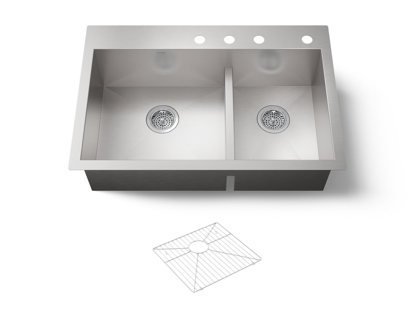 The distinctive, modern design of the KOHLER® Vault dual-mount sink lends a contemporary vibe to your kitchen. Handcrafted from stainless steel, this sink features tightly angled corners to maximize bowl space and a lowered divider for freedom of movement between bowls. When installed as a top-mount sink, Vault offers a low-profile rim that makes it easier to wipe from the countertop directly into the bowl. An optional bottom sink rack is available that fits in the large bowl to help prevent scratches.