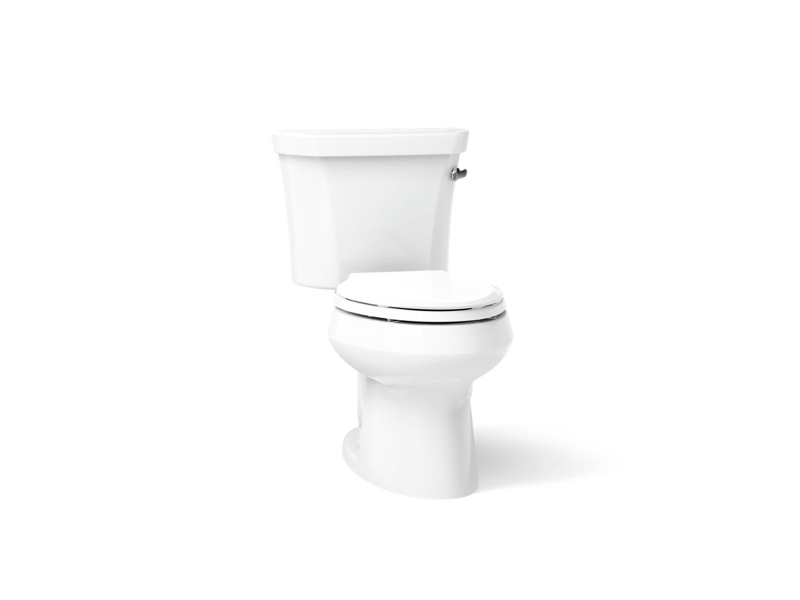 KOHLER® Wellworth toilets have been an American benchmark for style, innovation, and performance since 1936. This Wellworth high-efficiency two-piece elongated toilet delivers significant water savings with a 1.28-gallon flush setting that saves up to 16,500 gallons per year, compared to an old 3.5-gallon toilet, without sacrificing flush power. An elongated bowl enhances your comfort. Includes tank lid locks and a right-hand trip lever.