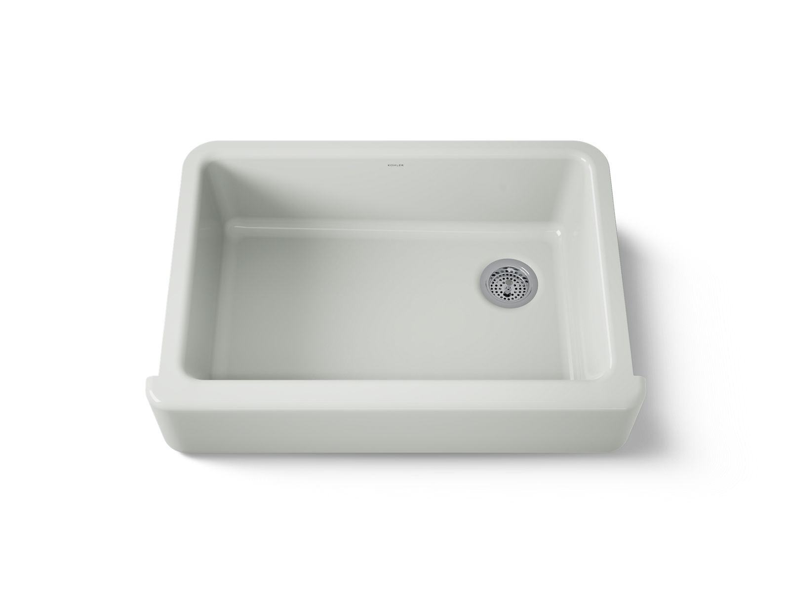 The KOHLER® Whitehaven apron-front kitchen sink features a streamlined and versatile farmhouse style to complement any decor. A large single basin accommodates large pots and pans, while the sloped bottom helps with draining and cleanup. Crafted from enameled cast iron, this sink resists chipping, cracking, or burning for years of beauty and reliable performance. A standard apron front makes it easy to install on 33-inch apron-front cabinetry. The Self-Trimming® design requires only a simple rough cut, overlapping the cabinet face for beautiful results.