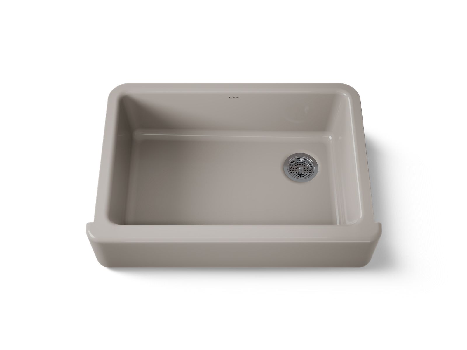 The KOHLER® Whitehaven apron-front kitchen sink features a streamlined and versatile farmhouse style to complement any decor. A large single basin accommodates large pots and pans, while the sloped bottom helps with draining and cleanup. Crafted from enameled cast iron, this sink resists chipping, cracking, or burning for years of beauty and reliable performance. A standard apron front makes it easy to install on 33-inch apron-front cabinetry. The Self-Trimming® design requires only a simple rough cut, overlapping the cabinet face for beautiful results.