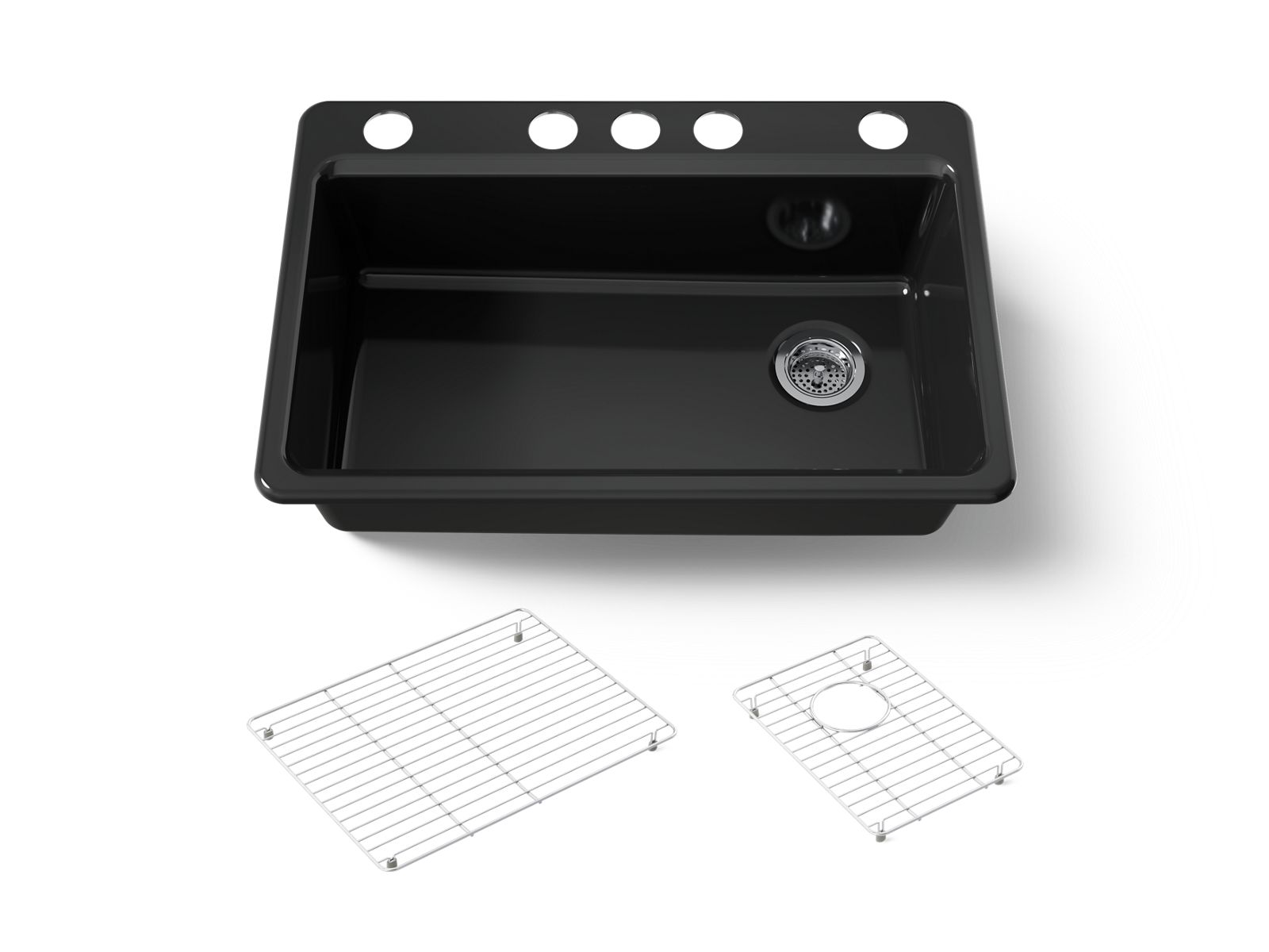The understated beauty of this KOHLER® Riverby sink makes it an elegant and versatile addition to the kitchen. A single, large bowl provides ample space to soak and wash cookware, while a sloped base to a single offset drain minimizes water pooling. Crafted from enameled cast iron, this undermount kitchen sink resists chipping, cracking, or burning for years of beauty and reliable performance. This Riverby sink includes two stainless steel sink racks.