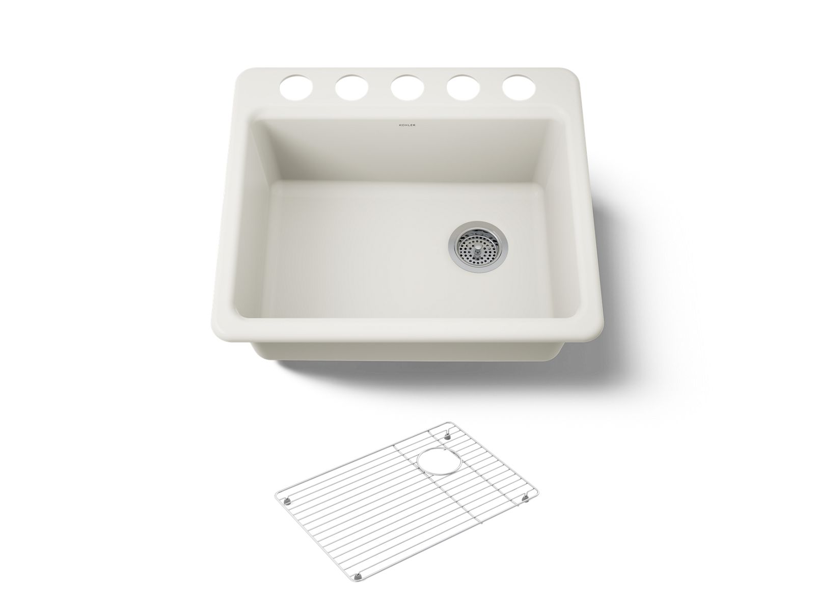 Sized to fit small spaces, the KOHLER® Riverby sink is an elegant and versatile addition to the kitchen as a primary, secondary, bar, or utility sink. A single-bowl provides ample space to soak and wash large items, while front and back beveled edges help keep water in the undermount kitchen sink . A sloped base to a single offset drain minimizes water pooling. Crafted from enameled cast iron, this sink resists chipping, cracking, or burning for years of beauty and reliable performance. An included custom-fit sink rack also helps protect the sink surface from daily wear.