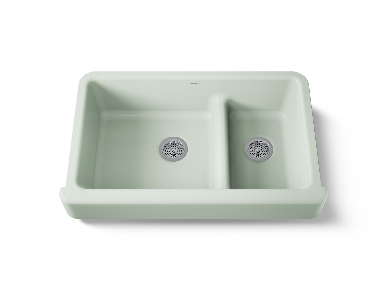 Kohler Whitehaven Smart Divide 35-1/2″ undermount double-bowl farmhouse kitchen sink with short apron - Aspen Green