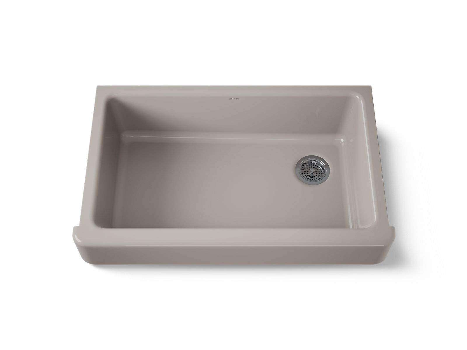 The KOHLER® Whitehaven apron-front kitchen sink features a streamlined and versatile farmhouse style to complement any decor. Perfect for remodeling projects, it has a shortened apron that allows for installation on most new or existing 36-inch standard cabinetry. The Self-Trimming design requires only a simple rough cut, overlapping the cabinet face for beautiful results and easy installation. A large single basin accommodates large pots and pans, while the sloped bottom helps with draining and cleanup. Crafted from enameled cast iron, this sink resists chipping, cracking, or burning for years of beauty and reliable performance.