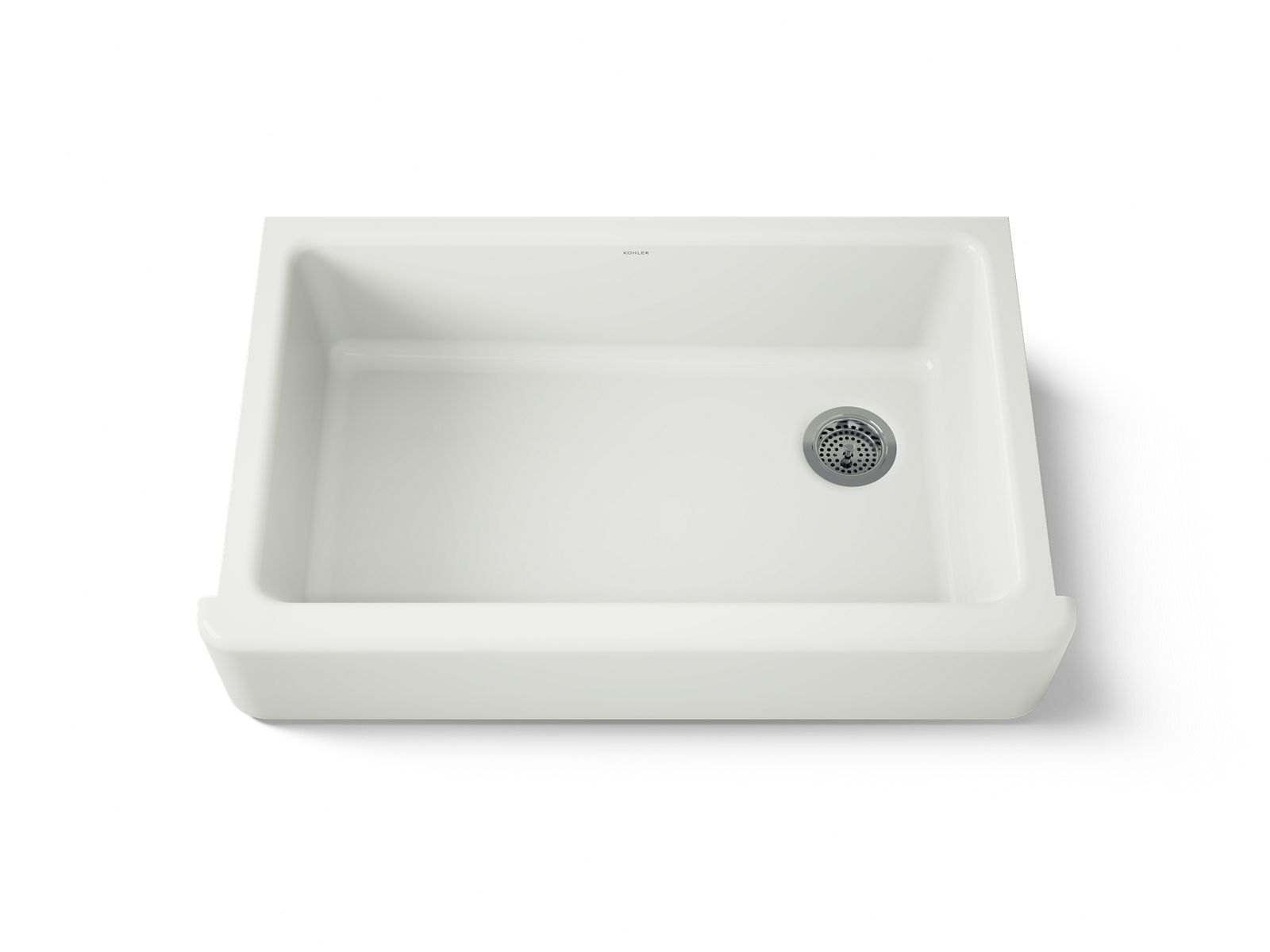 The KOHLER® Whitehaven apron-front kitchen sink features a streamlined and versatile farmhouse style to complement any decor. A large single basin accommodates large pots and pans, while the sloped bottom helps with draining and cleanup. Crafted from enameled cast iron, this sink resists chipping, cracking, or burning for years of beauty and reliable performance. A standard apron front makes it easy to install on 36-inch apron-front cabinetry. The Self-Trimming® design requires only a simple rough cut, overlapping the cabinet face for beautiful results.