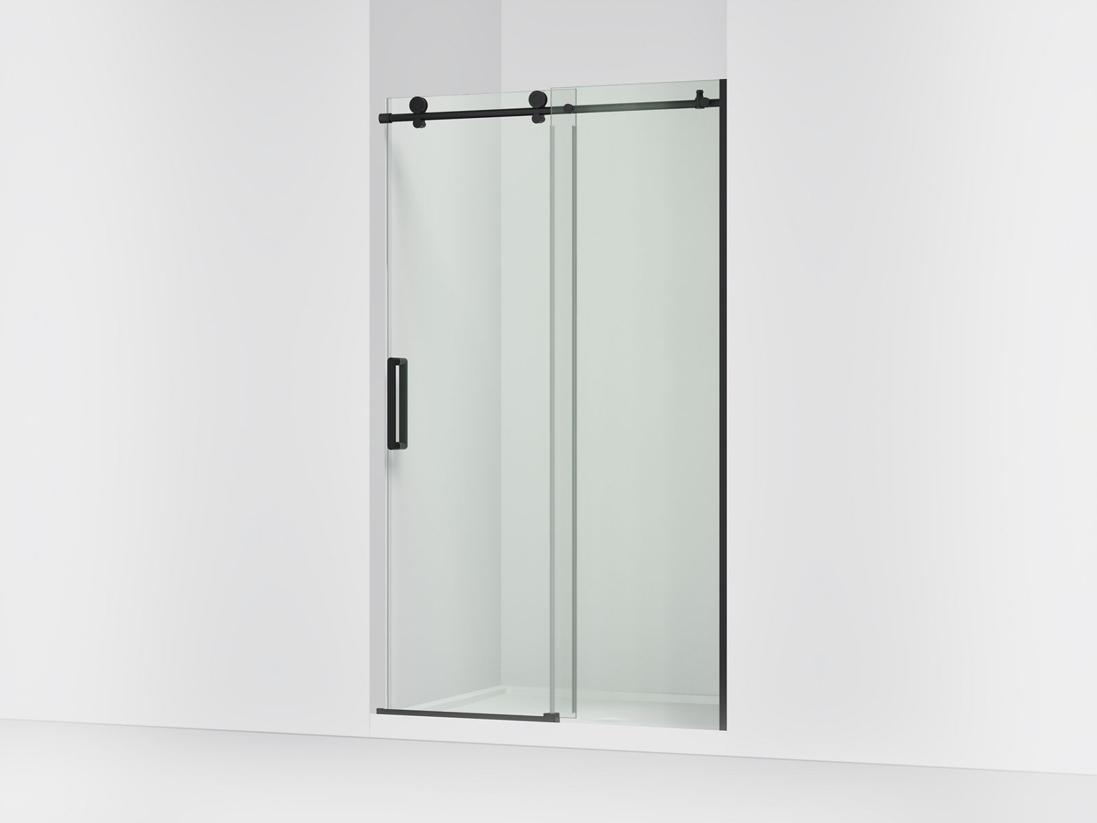 Add the final touch to your showering space with the luxurious, frameless KOHLER® Composed clear sliding shower door. This contemporary design includes exposed rollers engineered to glide across a heavy-duty top rail, offering a bold style statement and smooth operation. The door offers ample head clearance and features beautiful back-to-back handles for easy entry and exit. This shower door includes heavy 3/8" thick tempered glass and Controlled Close® technology on the sliding panel to securely close the door for exceptional water containment. Simple installation includes out-of-plumb adjustability of 3/8" on both the fixed and sliding glass panels.