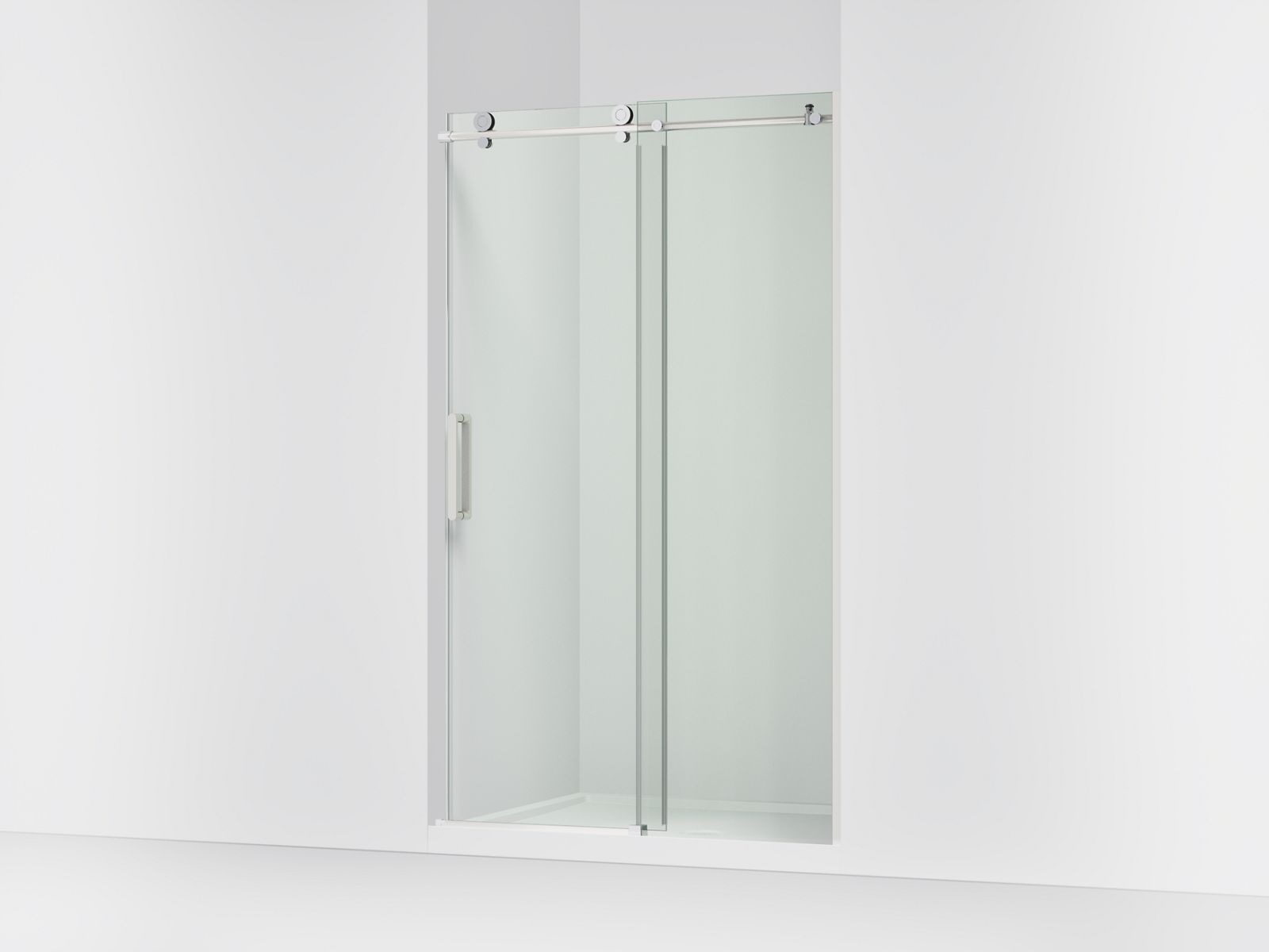 Add the final touch to your showering space with the luxurious, frameless KOHLER® Composed clear sliding shower door. This contemporary design includes exposed rollers engineered to glide across a heavy-duty top rail, offering a bold style statement and smooth operation. The door offers ample head clearance and features beautiful back-to-back handles for easy entry and exit. This shower door includes heavy 3/8" thick tempered glass and Controlled Close® technology on the sliding panel to securely close the door for exceptional water containment. Simple installation includes out-of-plumb adjustability of 3/8" on both the fixed and sliding glass panels.