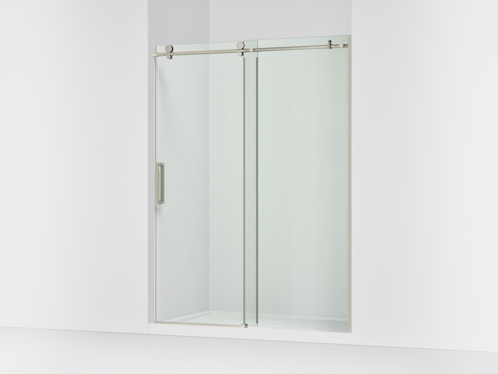 Add the final touch to your showering space with the luxurious, frameless KOHLER® Composed sliding shower door. This contemporary design includes exposed rollers engineered to glide across a heavy-duty top rail, offering a bold style statement and smooth operation. The door offers ample head clearance and features beautiful back-to-back handles for easy entry and exit. This clear sliding shower door includes heavy 3/8" thick tempered glass and Controlled Close® technology on the sliding panel to securely close the door for exceptional water containment. Simple installation includes out-of-plumb adjustability of 3/8" on both the fixed and sliding glass panels.